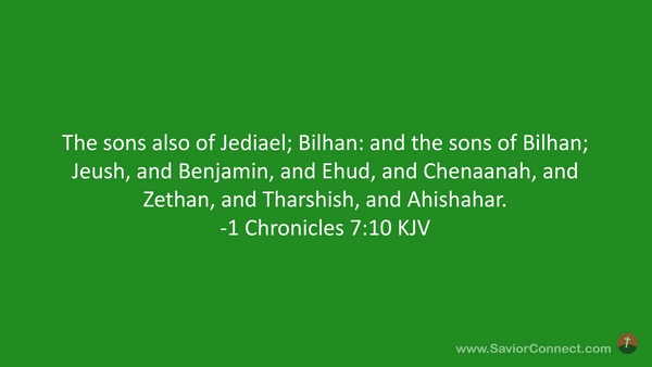 The sons also of Jediael; Bilhan: and the sons of Bilhan; Jeush, and Benjamin, and Ehud, and Chenaanah, and Zethan, and Tharshish, and Ahishahar. -1 Chronicles 7:10 KJV