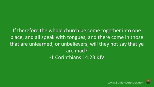 If therefore the whole church be come together into one place, and all speak with tongues, and there come in those that are unlearned, or unbelievers, will they not say that ye are mad? -1 Corinthians 14:23 KJV