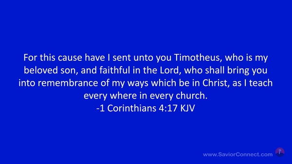 For this cause have I sent unto you Timotheus, who is my beloved son, and faithful in the Lord, who shall bring you into remembrance of my ways which be in Christ, as I teach every where in every church. -1 Corinthians 4:17 KJV