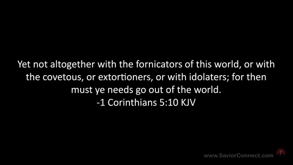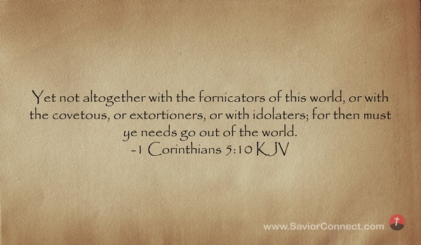 Yet not altogether with the fornicators of this world, or with the covetous, or extortioners, or with idolaters; for then must ye needs go out of the world. -1 Corinthians 5:10 KJV