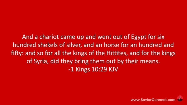 And a chariot came up and went out of Egypt for six hundred shekels of silver, and an horse for an hundred and fifty: and so for all the kings of the Hittites, and for the kings of Syria, did they bring them out by their means. -1 Kings 10:29 KJV