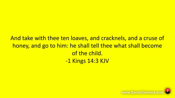 And take with thee ten loaves, and cracknels, and a cruse of honey, and go to him: he shall tell thee what shall become of the child. -1 Kings 14:3 KJV