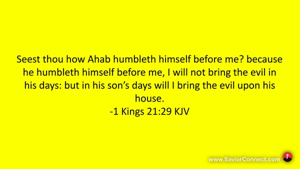 Seest thou how Ahab humbleth himself before me? because he humbleth himself before me, I will not bring the evil in his days: but in his son's days will I bring the evil upon his house. -1 Kings 21:29 KJV