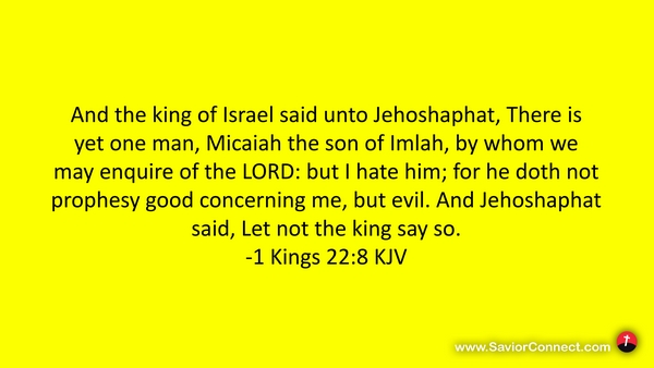 And the king of Israel said unto Jehoshaphat, There is yet one man, Micaiah the son of Imlah, by whom we may enquire of the LORD: but I hate him; for he doth not prophesy good concerning me, but evil. And Jehoshaphat said, Let not the king say so. -1 Kings 22:8 KJV