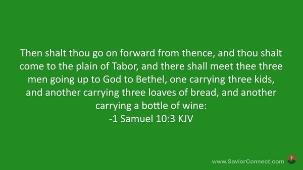 Then shalt thou go on forward from thence, and thou shalt come to the plain of Tabor, and there shall meet thee three men going up to God to Bethel, one carrying three kids, and another carrying three loaves of bread, and another carrying a bottle of wine: -1 Samuel 10:3 KJV