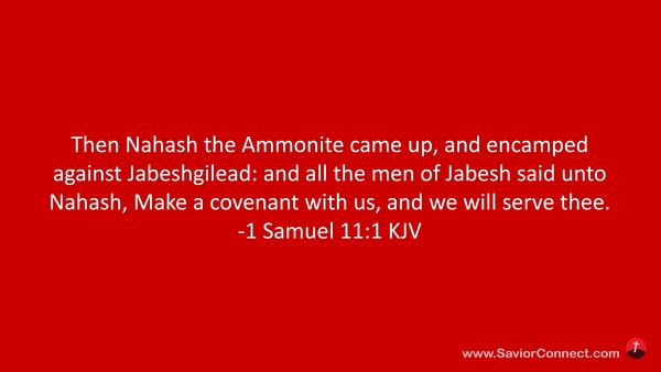 Then Nahash the Ammonite came up, and encamped against Jabeshgilead: and all the men of Jabesh said unto Nahash, Make a covenant with us, and we will serve thee. -1 Samuel 11:1 KJV