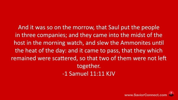 And it was so on the morrow, that Saul put the people in three companies; and they came into the midst of the host in the morning watch, and slew the Ammonites until the heat of the day: and it came to pass, that they which remained were scattered, so that two of them were not left together. -1 Samuel 11:11 KJV