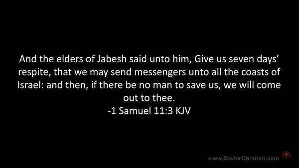 And the elders of Jabesh said unto him, Give us seven days' respite, that we may send messengers unto all the coasts of Israel: and then, if there be no man to save us, we will come out to thee. -1 Samuel 11:3 KJV