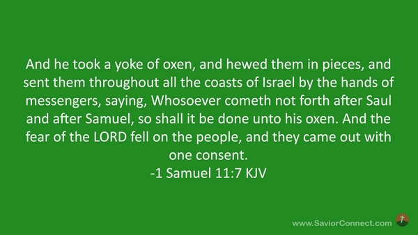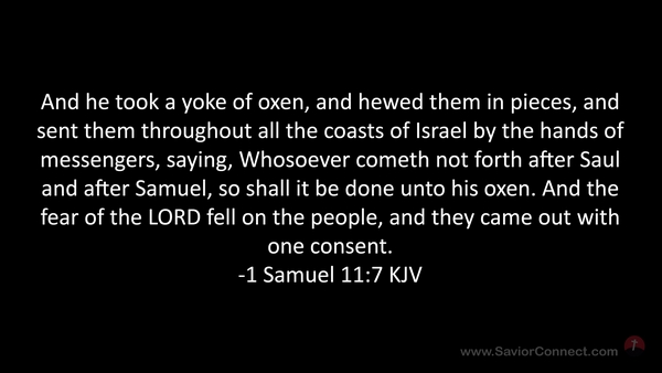 And he took a yoke of oxen, and hewed them in pieces, and sent them throughout all the coasts of Israel by the hands of messengers, saying, Whosoever cometh not forth after Saul and after Samuel, so shall it be done unto his oxen. And the fear of the LORD fell on the people, and they came out with one consent. -1 Samuel 11:7 KJV
