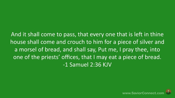 And it shall come to pass, that every one that is left in thine house shall come and crouch to him for a piece of silver and a morsel of bread, and shall say, Put me, I pray thee, into one of the priests' offices, that I may eat a piece of bread. -1 Samuel 2:36 KJV