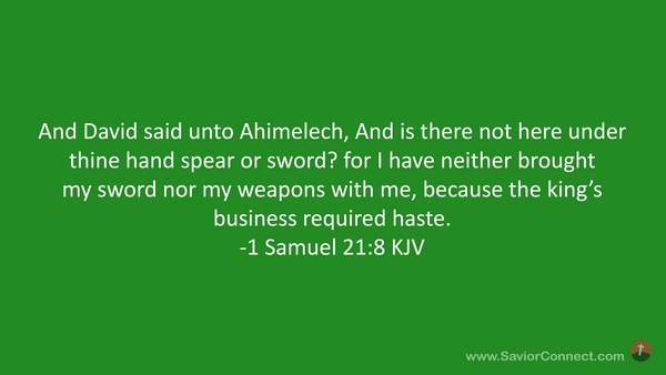 And David said unto Ahimelech, And is there not here under thine hand spear or sword? for I have neither brought my sword nor my weapons with me, because the king's business required haste. -1 Samuel 21:8 KJV