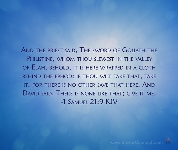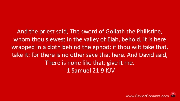 And the priest said, The sword of Goliath the Philistine, whom thou slewest in the valley of Elah, behold, it is here wrapped in a cloth behind the ephod: if thou wilt take that, take it: for there is no other save that here. And David said, There is none like that; give it me. -1 Samuel 21:9 KJV