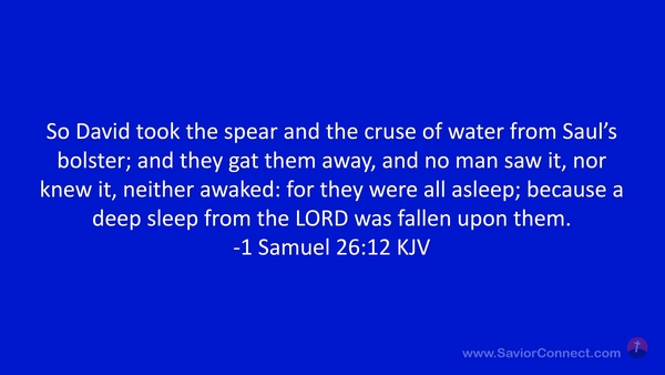 So David took the spear and the cruse of water from Saul's bolster; and they gat them away, and no man saw it, nor knew it, neither awaked: for they were all asleep; because a deep sleep from the LORD was fallen upon them. -1 Samuel 26:12 KJV