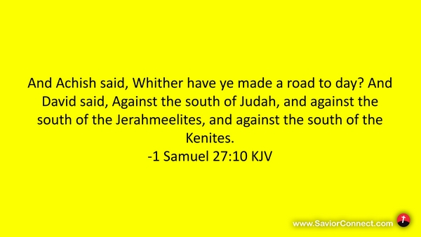 And Achish said, Whither have ye made a road to day? And David said, Against the south of Judah, and against the south of the Jerahmeelites, and against the south of the Kenites. -1 Samuel 27:10 KJV