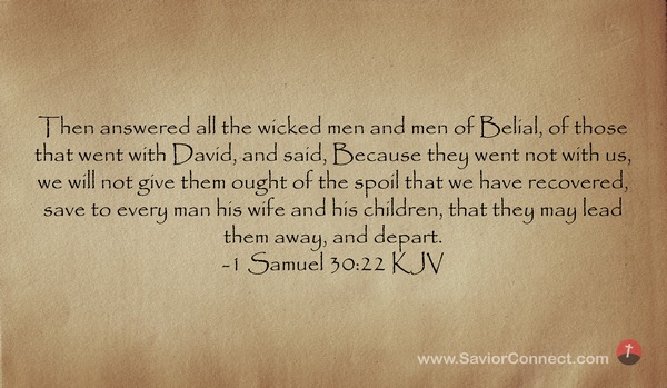 Then answered all the wicked men and men of Belial, of those that went with David, and said, Because they went not with us, we will not give them ought of the spoil that we have recovered, save to every man his wife and his children, that they may lead them away, and depart. -1 Samuel 30:22 KJV