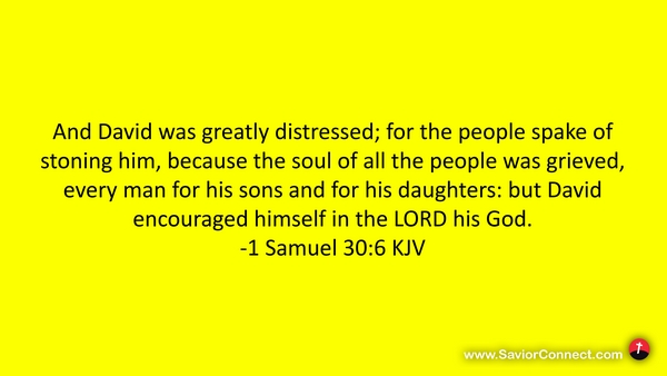 And David was greatly distressed; for the people spake of stoning him, because the soul of all the people was grieved, every man for his sons and for his daughters: but David encouraged himself in the LORD his God. -1 Samuel 30:6 KJV