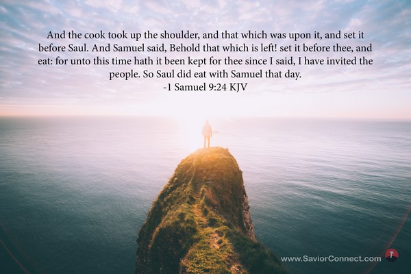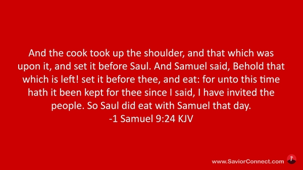 And the cook took up the shoulder, and that which was upon it, and set it before Saul. And Samuel said, Behold that which is left! set it before thee, and eat: for unto this time hath it been kept for thee since I said, I have invited the people. So Saul did eat with Samuel that day. -1 Samuel 9:24 KJV