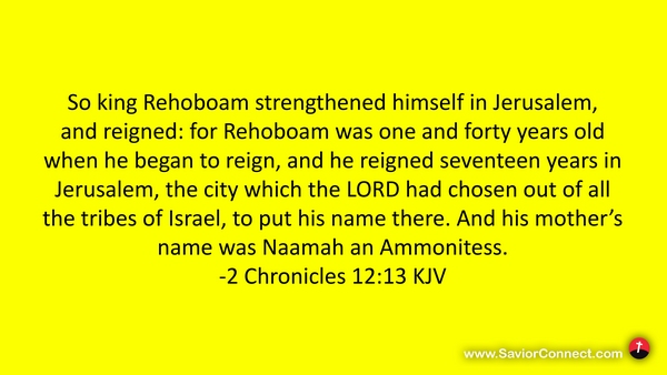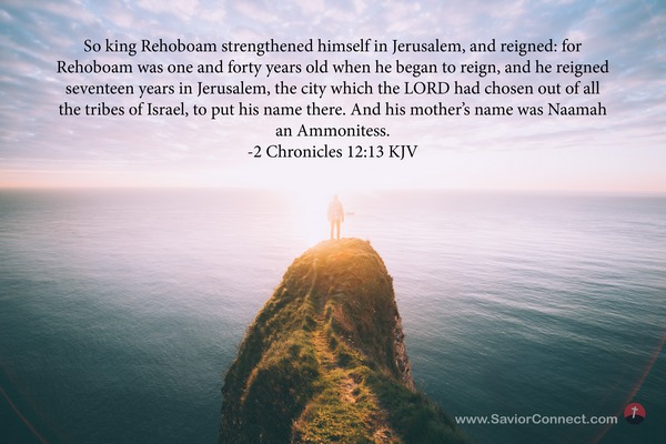 So king Rehoboam strengthened himself in Jerusalem, and reigned: for Rehoboam was one and forty years old when he began to reign, and he reigned seventeen years in Jerusalem, the city which the LORD had chosen out of all the tribes of Israel, to put his name there. And his mother's name was Naamah an Ammonitess. -2 Chronicles 12:13 KJV