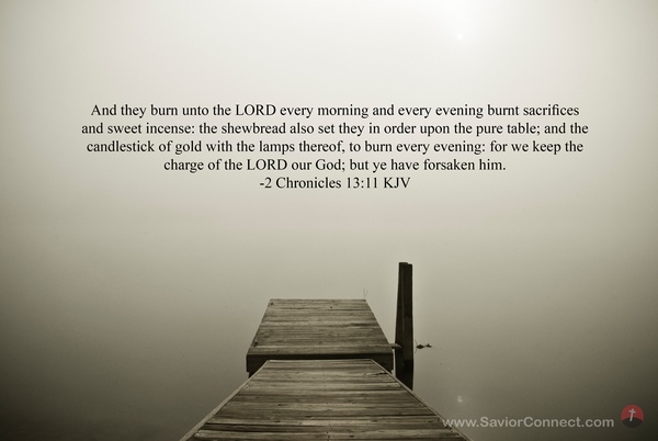 And they burn unto the LORD every morning and every evening burnt sacrifices and sweet incense: the shewbread also set they in order upon the pure table; and the candlestick of gold with the lamps thereof, to burn every evening: for we keep the charge of the LORD our God; but ye have forsaken him. -2 Chronicles 13:11 KJV