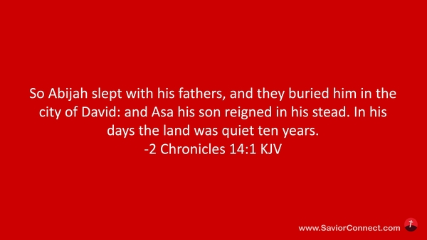So Abijah slept with his fathers, and they buried him in the city of David: and Asa his son reigned in his stead. In his days the land was quiet ten years. -2 Chronicles 14:1 KJV
