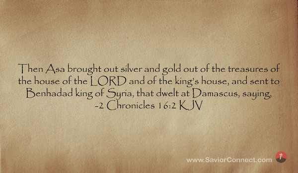 Then Asa brought out silver and gold out of the treasures of the house of the LORD and of the king's house, and sent to Benhadad king of Syria, that dwelt at Damascus, saying, -2 Chronicles 16:2 KJV