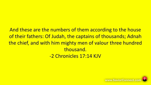 And these are the numbers of them according to the house of their fathers: Of Judah, the captains of thousands; Adnah the chief, and with him mighty men of valour three hundred thousand. -2 Chronicles 17:14 KJV