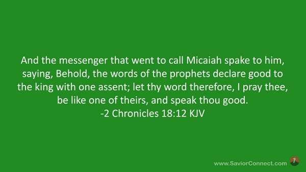 And the messenger that went to call Micaiah spake to him, saying, Behold, the words of the prophets declare good to the king with one assent; let thy word therefore, I pray thee, be like one of theirs, and speak thou good. -2 Chronicles 18:12 KJV