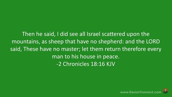 Then he said, I did see all Israel scattered upon the mountains, as sheep that have no shepherd: and the LORD said, These have no master; let them return therefore every man to his house in peace. -2 Chronicles 18:16 KJV