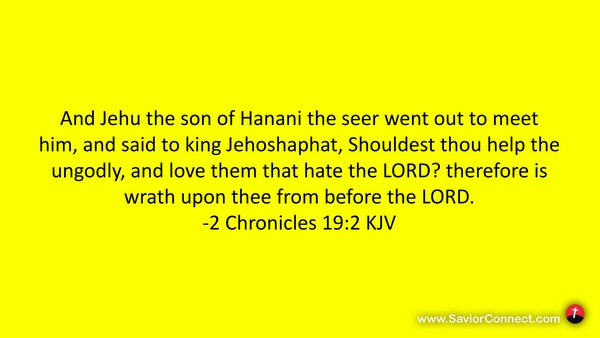 And Jehu the son of Hanani the seer went out to meet him, and said to king Jehoshaphat, Shouldest thou help the ungodly, and love them that hate the LORD? therefore is wrath upon thee from before the LORD. -2 Chronicles 19:2 KJV