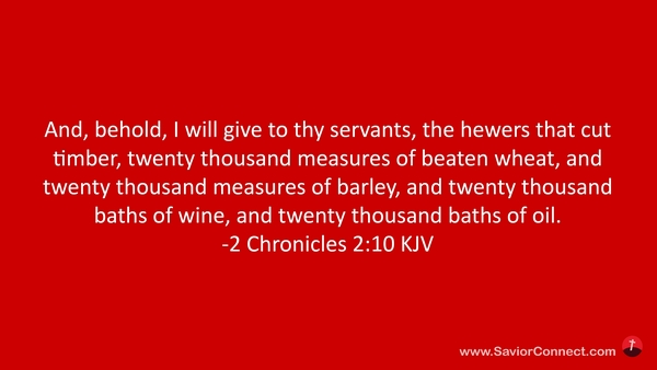 And, behold, I will give to thy servants, the hewers that cut timber, twenty thousand measures of beaten wheat, and twenty thousand measures of barley, and twenty thousand baths of wine, and twenty thousand baths of oil. -2 Chronicles 2:10 KJV