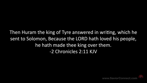 Then Huram the king of Tyre answered in writing, which he sent to Solomon, Because the LORD hath loved his people, he hath made thee king over them. -2 Chronicles 2:11 KJV