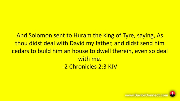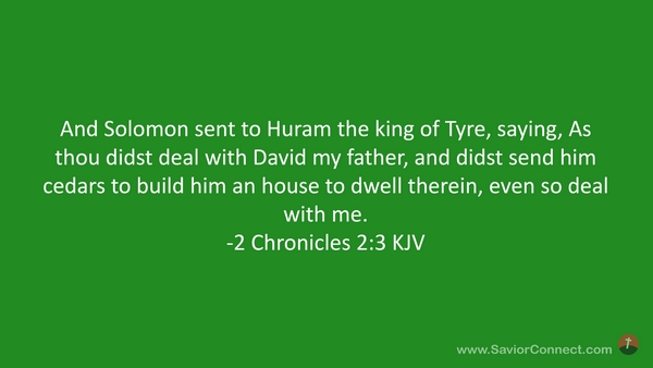 And Solomon sent to Huram the king of Tyre, saying, As thou didst deal with David my father, and didst send him cedars to build him an house to dwell therein, even so deal with me. -2 Chronicles 2:3 KJV
