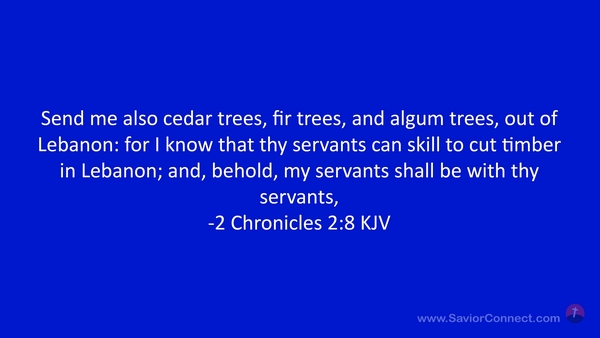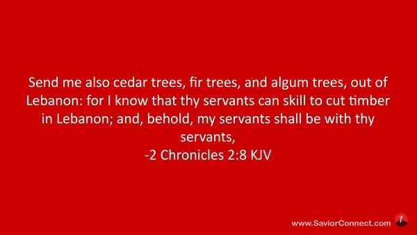 Send me also cedar trees, fir trees, and algum trees, out of Lebanon: for I know that thy servants can skill to cut timber in Lebanon; and, behold, my servants shall be with thy servants, -2 Chronicles 2:8 KJV