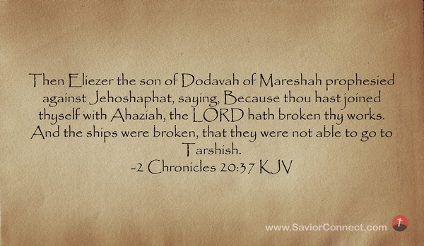 Then Eliezer the son of Dodavah of Mareshah prophesied against Jehoshaphat, saying, Because thou hast joined thyself with Ahaziah, the LORD hath broken thy works. And the ships were broken, that they were not able to go to Tarshish. -2 Chronicles 20:37 KJV
