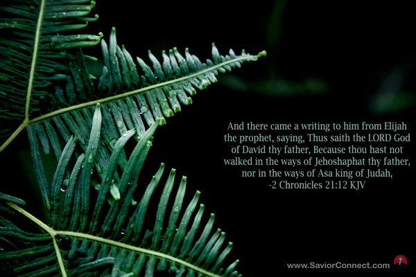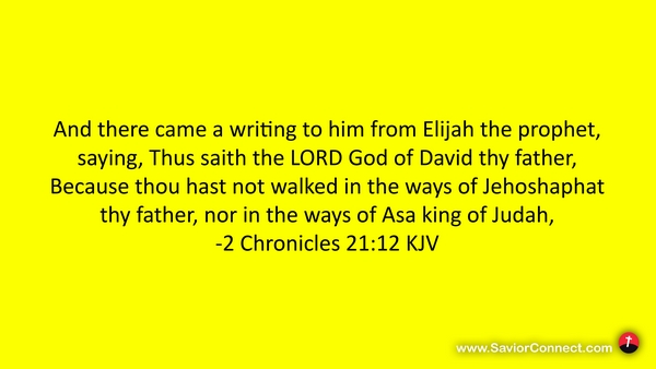 And there came a writing to him from Elijah the prophet, saying, Thus saith the LORD God of David thy father, Because thou hast not walked in the ways of Jehoshaphat thy father, nor in the ways of Asa king of Judah, -2 Chronicles 21:12 KJV