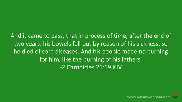 And it came to pass, that in process of time, after the end of two years, his bowels fell out by reason of his sickness: so he died of sore diseases. And his people made no burning for him, like the burning of his fathers. -2 Chronicles 21:19 KJV