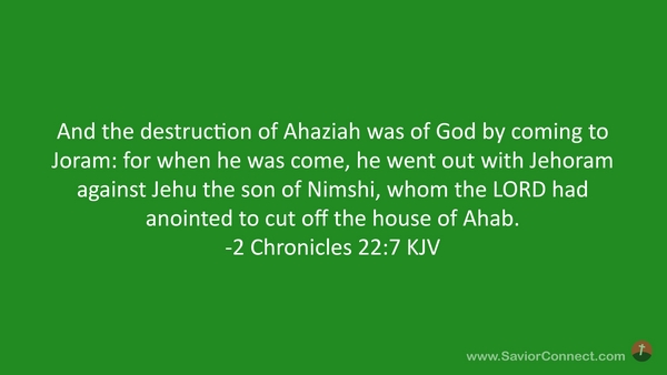 And the destruction of Ahaziah was of God by coming to Joram: for when he was come, he went out with Jehoram against Jehu the son of Nimshi, whom the LORD had anointed to cut off the house of Ahab. -2 Chronicles 22:7 KJV