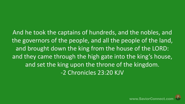 And he took the captains of hundreds, and the nobles, and the governors of the people, and all the people of the land, and brought down the king from the house of the LORD: and they came through the high gate into the king's house, and set the king upon the throne of the kingdom. -2 Chronicles 23:20 KJV