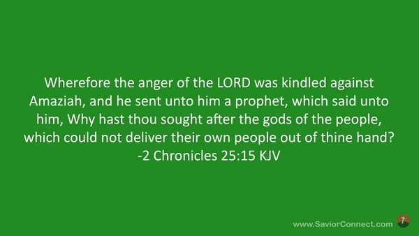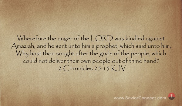 Wherefore the anger of the LORD was kindled against Amaziah, and he sent unto him a prophet, which said unto him, Why hast thou sought after the gods of the people, which could not deliver their own people out of thine hand? -2 Chronicles 25:15 KJV