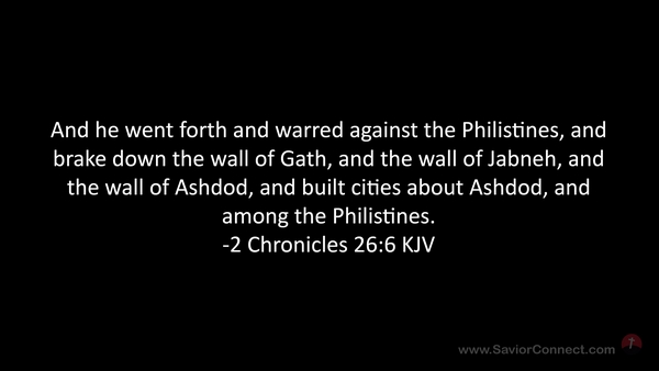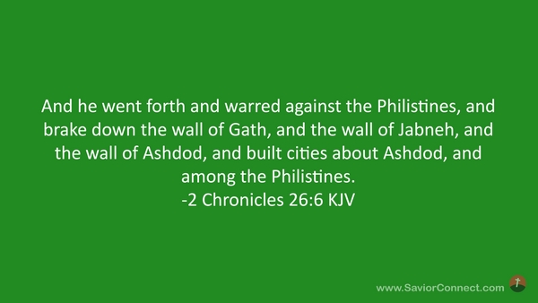 And he went forth and warred against the Philistines, and brake down the wall of Gath, and the wall of Jabneh, and the wall of Ashdod, and built cities about Ashdod, and among the Philistines. -2 Chronicles 26:6 KJV