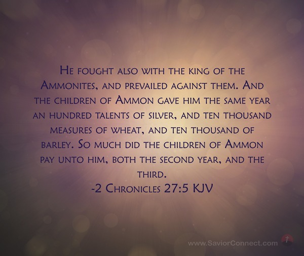 He fought also with the king of the Ammonites, and prevailed against them. And the children of Ammon gave him the same year an hundred talents of silver, and ten thousand measures of wheat, and ten thousand of barley. So much did the children of Ammon pay unto him, both the second year, and the third. -2 Chronicles 27:5 KJV