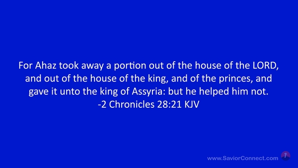 For Ahaz took away a portion out of the house of the LORD, and out of the house of the king, and of the princes, and gave it unto the king of Assyria: but he helped him not. -2 Chronicles 28:21 KJV
