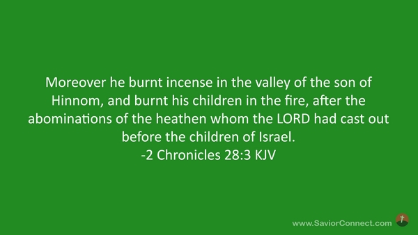 Moreover he burnt incense in the valley of the son of Hinnom, and burnt his children in the fire, after the abominations of the heathen whom the LORD had cast out before the children of Israel. -2 Chronicles 28:3 KJV