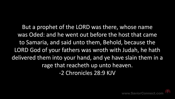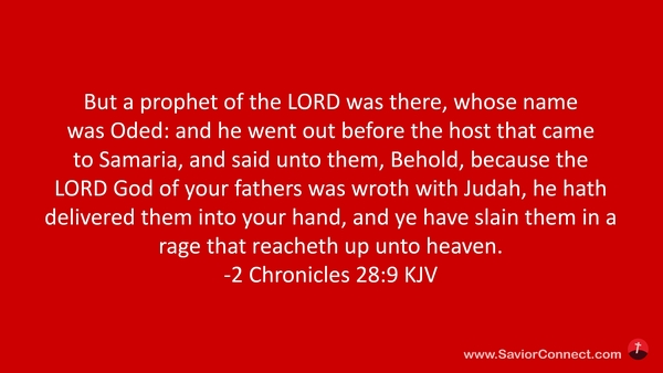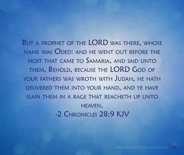 But a prophet of the LORD was there, whose name was Oded: and he went out before the host that came to Samaria, and said unto them, Behold, because the LORD God of your fathers was wroth with Judah, he hath delivered them into your hand, and ye have slain them in a rage that reacheth up unto heaven. -2 Chronicles 28:9 KJV