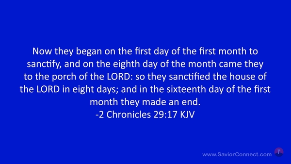 Now they began on the first day of the first month to sanctify, and on the eighth day of the month came they to the porch of the LORD: so they sanctified the house of the LORD in eight days; and in the sixteenth day of the first month they made an end. -2 Chronicles 29:17 KJV