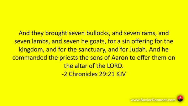 And they brought seven bullocks, and seven rams, and seven lambs, and seven he goats, for a sin offering for the kingdom, and for the sanctuary, and for Judah. And he commanded the priests the sons of Aaron to offer them on the altar of the LORD. -2 Chronicles 29:21 KJV
