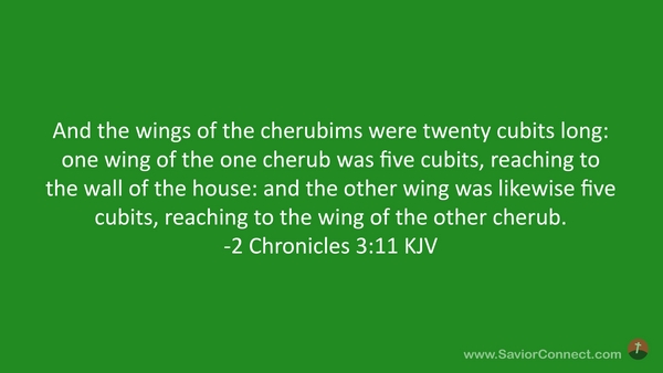 And the wings of the cherubims were twenty cubits long: one wing of the one cherub was five cubits, reaching to the wall of the house: and the other wing was likewise five cubits, reaching to the wing of the other cherub. -2 Chronicles 3:11 KJV