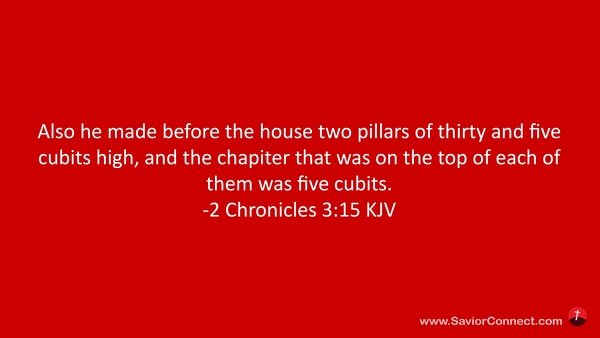 Also he made before the house two pillars of thirty and five cubits high, and the chapiter that was on the top of each of them was five cubits. -2 Chronicles 3:15 KJV