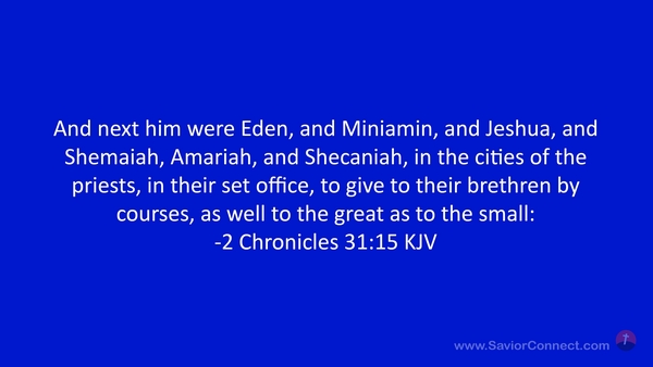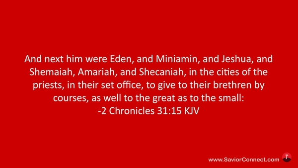 And next him were Eden, and Miniamin, and Jeshua, and Shemaiah, Amariah, and Shecaniah, in the cities of the priests, in their set office, to give to their brethren by courses, as well to the great as to the small: -2 Chronicles 31:15 KJV