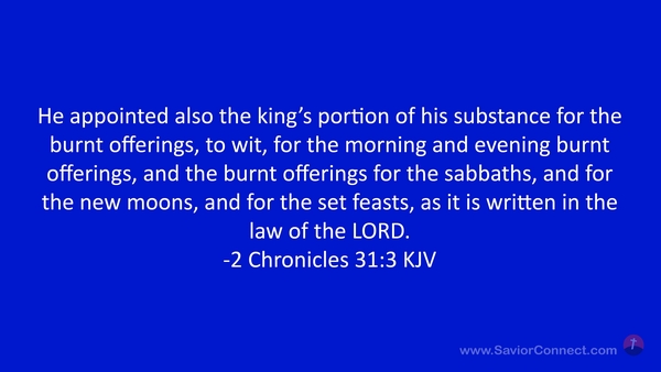 He appointed also the king's portion of his substance for the burnt offerings, to wit, for the morning and evening burnt offerings, and the burnt offerings for the sabbaths, and for the new moons, and for the set feasts, as it is written in the law of the LORD. -2 Chronicles 31:3 KJV